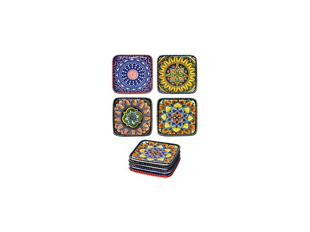 Elegantní čtvercová keramická mistička/malý servírovací talíř z kolekce Sicilia odráží temperament Středomoří a je dokonale univerzální – hodí se na olivy, ořechy, malé tapas nebo jako dekorativní doplněk stolu. Každý kus je originální ručně vyráběná keramika, zdobená ručně malovanými ornamenty inspirovanými sicilskou kulturou. Tradiční keramika ze Španělska v těchto barvách rozzáří každý stůl a přinese atmosféru dovolené na jihu.